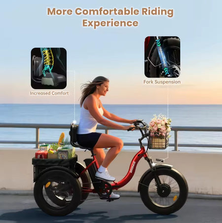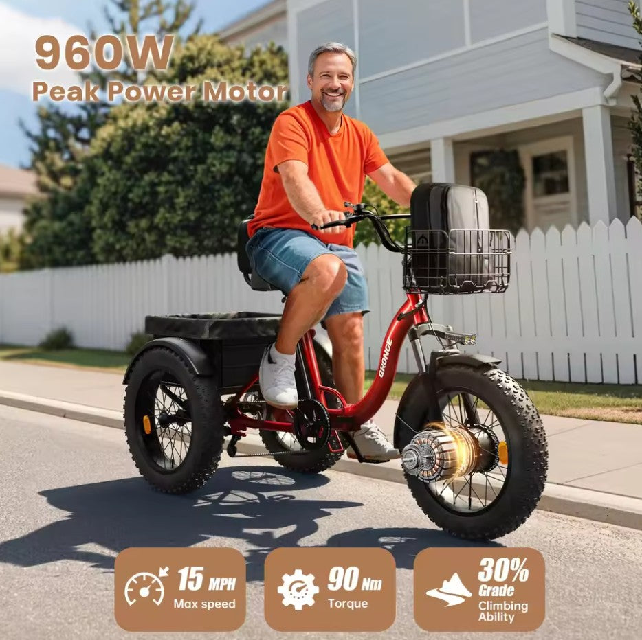Diseñado para la versatilidad y un rango extendido, este triciclo eléctrico de 960W ofrece un rendimiento robusto con un sistema de batería de 36V 13.5AH capaz de recorrer 50 millas. El diseño de neumáticos anchos garantiza estabilidad y tracción en diversos terrenos, mientras que el marco plegable maximiza la portabilidad sin sacrificar la capacidad. Una cesta de almacenamiento integrada permite guardar carga y elementos esenciales diarios, lo que lo convierte en una solución eficiente para ciclistas adultos que buscan movilidad eléctrica confiable con funcionalidad práctica.