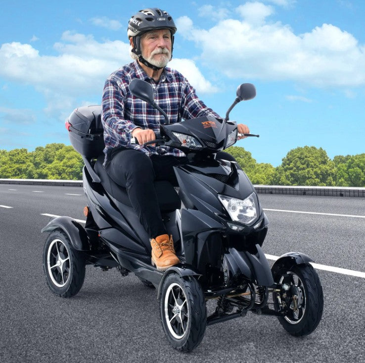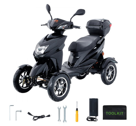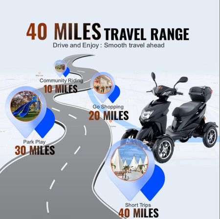 Smooth and Ultra-Long Range: Ready for a smooth and enjoyable ride? This heavy duty 4-wheel mobility scooter has got you covered with a 48V 20Ah long-range extended battery, taking you up to 40 miles on a single charge. Glide effortlessly over grass, pavement, gravel, and bumps with its 4 wide tubeless tires.