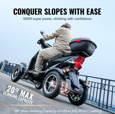 Conquer Slopes with Ease: Powered by a 500W robust motor, our all-terrain mobility scooters for seniors & adults can easily drive up slopes and small hills up to 20 degrees. With a 450-pound strong loading capacity.