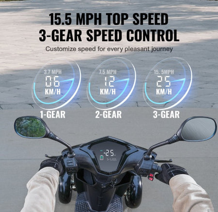 3-Speed Control, Ride Your Way: Tailor your journey with 3-speed settings: 1st gear-3.7 MPH for leisurely strolls, 2nd gear-7.5 MPH for daily commuting, and 3rd gear-15.5 MPH.