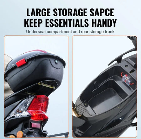 Spacious Storage Space: Experience a comfortable driving with convenient storage solutions! Our heavy duty mobility scooter for travel features an extended comfort seat, spacious underseat compartment, and lockable rear trunk.