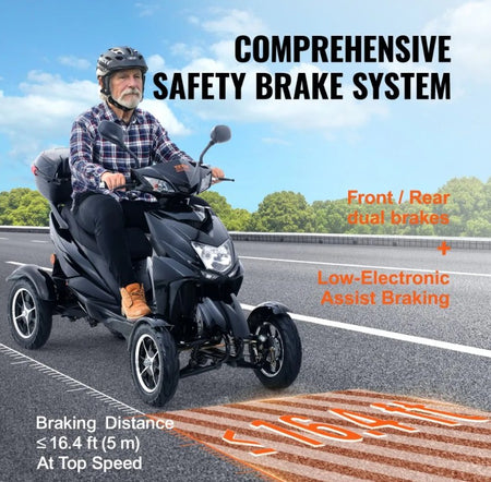 Safety in Every Ride: Enhanced with front /rear dual brakes and low-electronic assist braking system, our electric wheelchairs for seniors ensure a safe braking distance of ≤16.4 ft at top speed. A full lighting system, 4.7-inch height from ground.