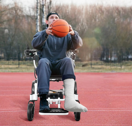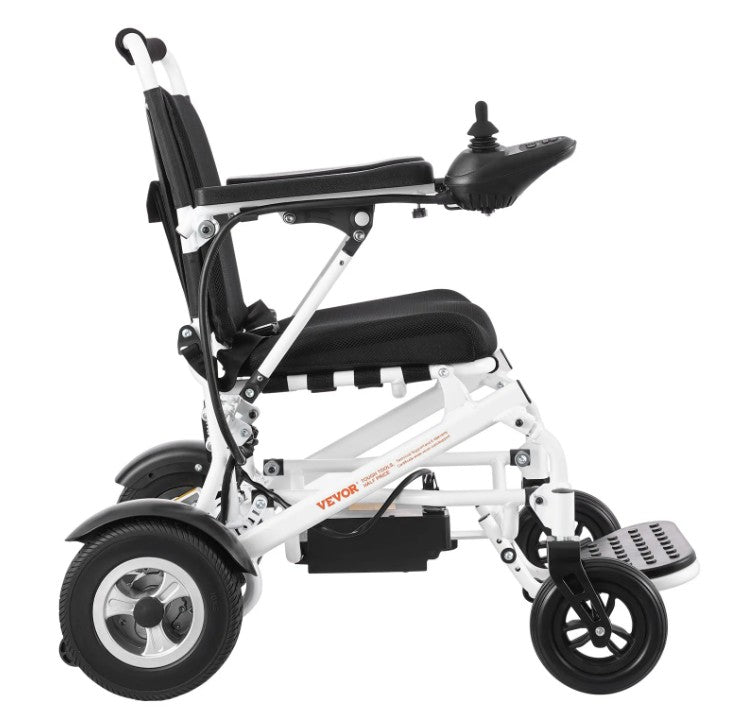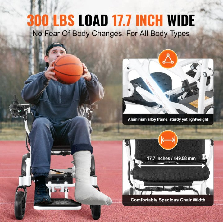 Electric Foldable Wheelchair with Portable 17.7" Seat All-Terrain This motorized wheelchair combines comfort and convenience for adults and seniors. Features a 300 lbs weight capacity, one-button folding design, and 12.5-mile range per charge. The 5-speed joystick control offers easy one-handed operation with adjustable left or right positioning. Durable 10-inch solid tires handle slopes up to 10° with excellent grip. Lightweight aluminum alloy frame folds compactly for transport. Removable battery charges in 8-12 hours. Top speed of 6 km/h ensures safe, stable travel for daily mobility needs.
