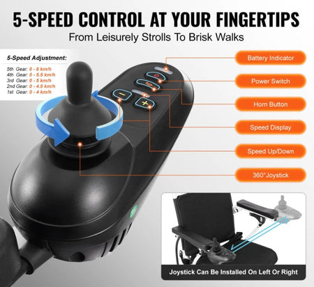 - Effortless 5-Speed Control: Easily control the speed with one-handed operation. The joystick can be installed on either the left or right side and features 5-speed settings, battery display, power switch, horn button, speed display, and acceleration/deceleration keys.