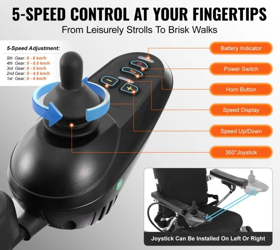 - Effortless 5-Speed Control: Easily control the speed with one-handed operation. The joystick can be installed on either the left or right side and features 5-speed settings, battery display, power switch, horn button, speed display, and acceleration/deceleration keys.