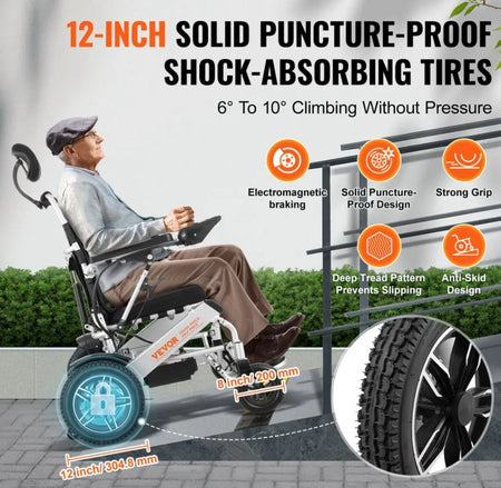 - 12-Inch Solid Tires: The solid, explosion-proof design ensures tire stability and durability. Whether climbing a 6° or 10° slope, the deep tread pattern increases grip, effectively preventing slipping and sliding. The front wheel diameter is 8 inches, and the rear wheel diameter is 12 inches.