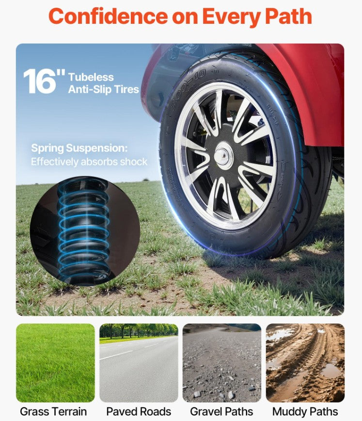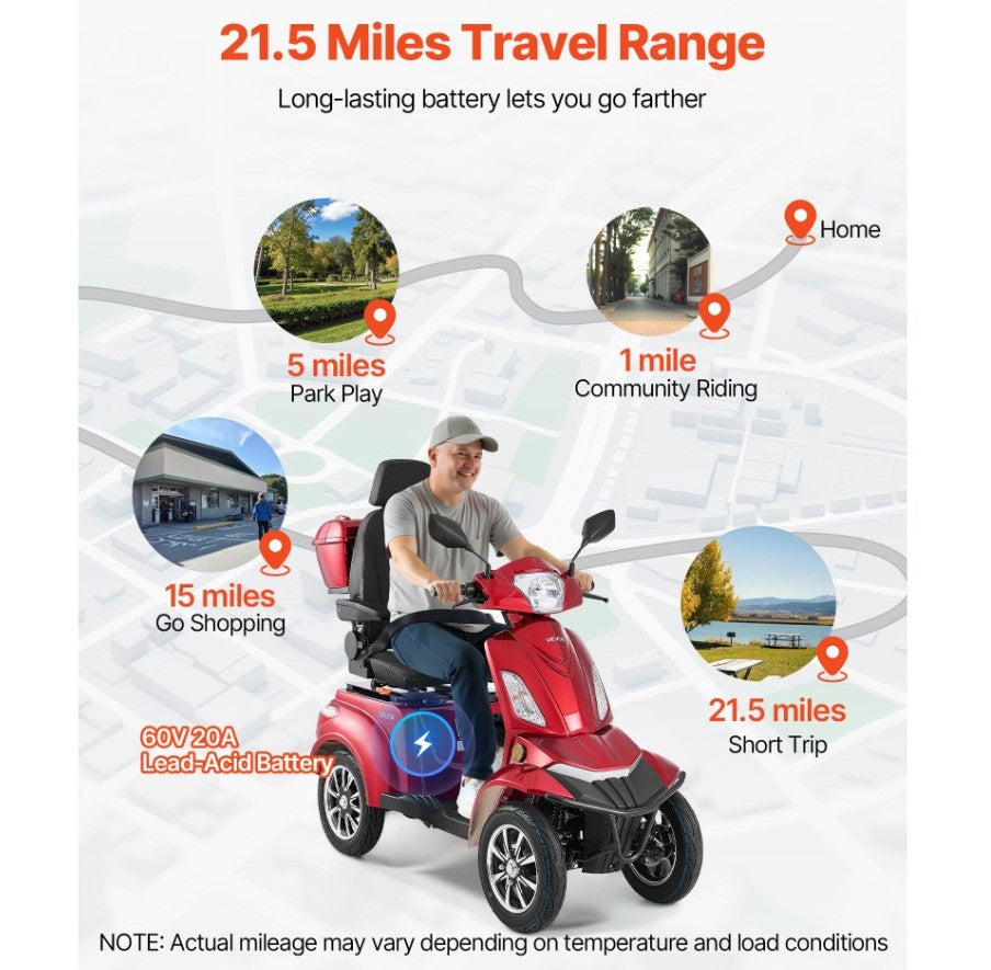 - Stable Ride: Our heavy-duty 4-wheel mobility scooter is powered by a 60V 20A rechargeable lead-acid battery, delivering long-lasting performance with a driving range of up to 35 km / 21.5 mi per full charge. Deep-tread, no-inflation tires.