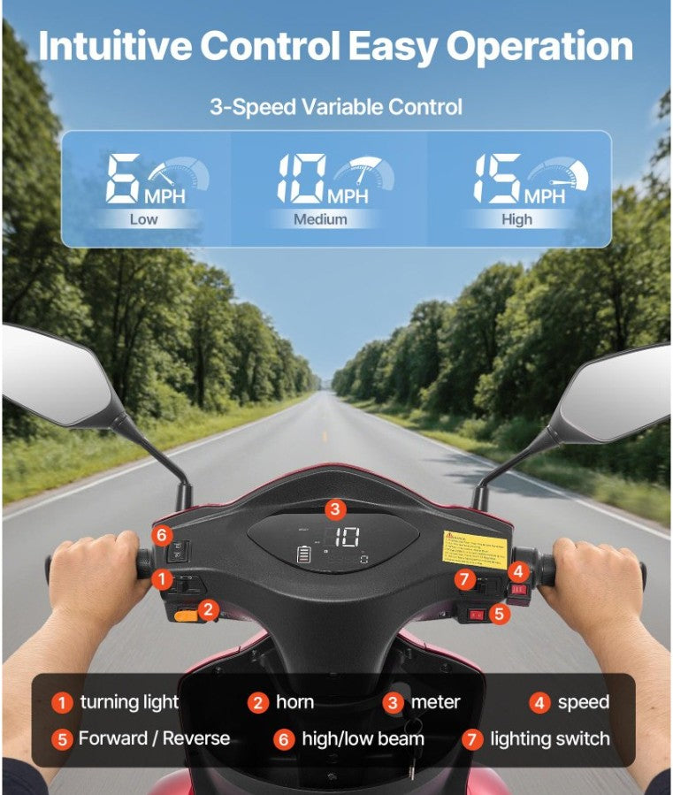 - 3-Speed Flexibility: Our electric recreational mobility scooter features three adjustable speed modes (6 MPH / 10 MPH / 15 MPH), allowing you to adapt as needed. Whether for shopping or scenic rides, it’s an ideal choice for seniors. The dashboard clearly displays speed, mileage, and battery status for real-time.