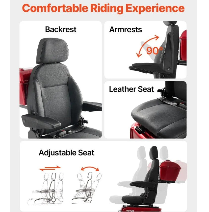 - Comfortable Design: This heavy-duty mobility scooter comes with a backrest seat that can be adjusted forward and backward, leaving ample legroom. It also features a headrest for added comfort and support. Both armrests can be raised or flipped back for easy boarding and exiting. A rear storage box and a dashboard compartment provide convenient space for daily outings and shopping needs.