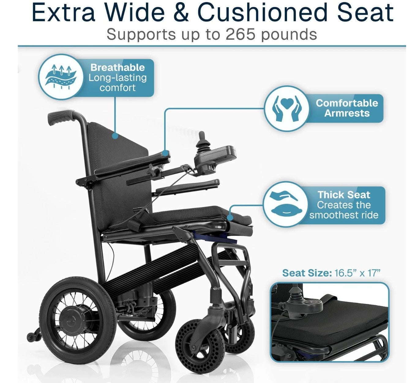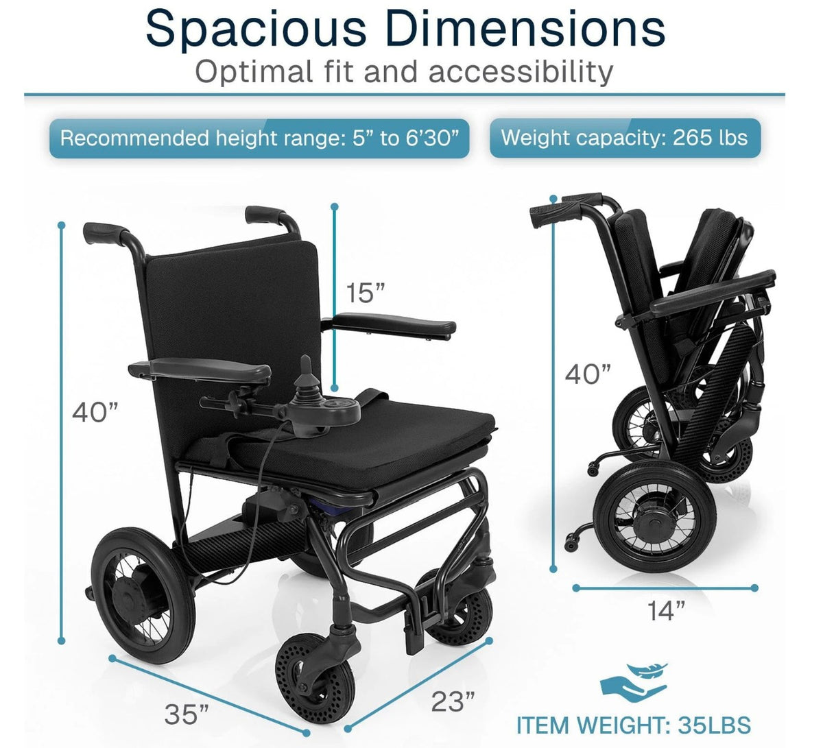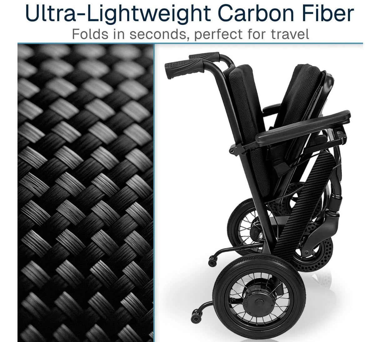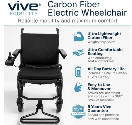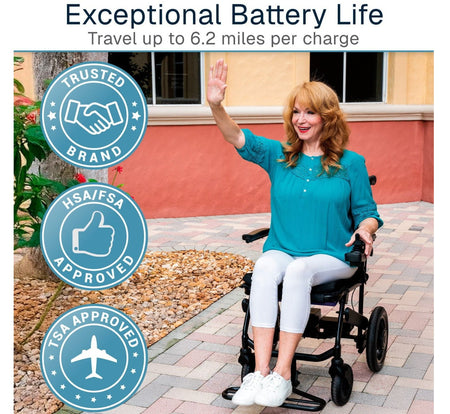 This hybrid power wheelchair combines carbon fiber and aluminum construction to achieve a remarkably light 39-pound frame, battery included. The compact design excels in confined spaces while maintaining stability and comfort for extended wear, delivering a 265-pound weight capacity. Quick-folding mechanics facilitate convenient transport, and the responsive 5-speed joystick provides intuitive directional control. A robust lithium battery system ensures extended runtime between charges, while the ventilated seat cushioning promotes airflow during prolonged use. Ideal for individuals seeking a maneuverable, travel-friendly power chair that doesn't sacrifice performance or durability.